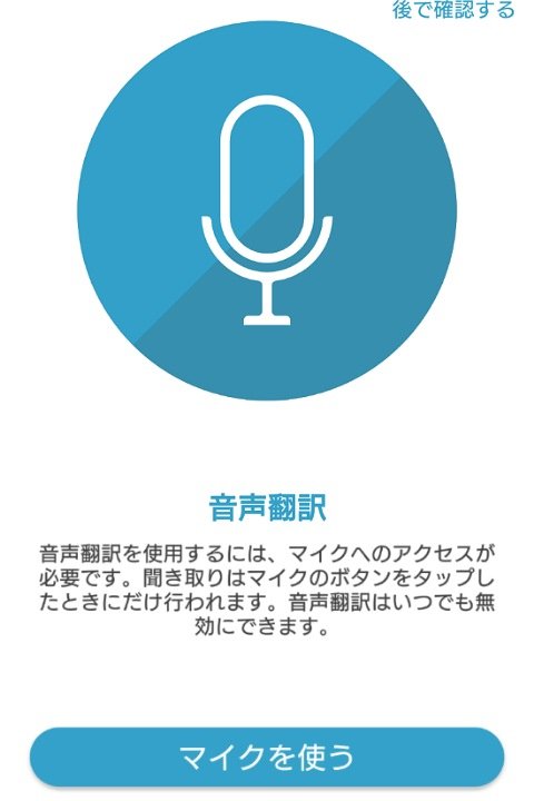 次は音声入力を許可します。音声による入力をするにはスマホのマイクへのアクセスが必要になるので、「マイクを使う」ボタンを押してアプリがマイクへのアクセスができるように許可をしてあげましょう。